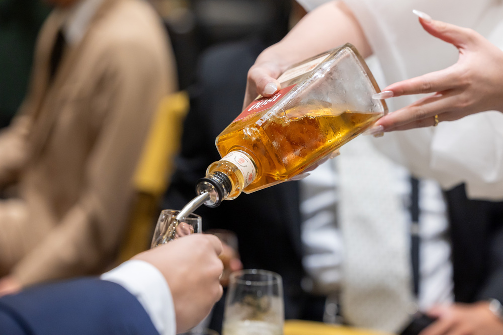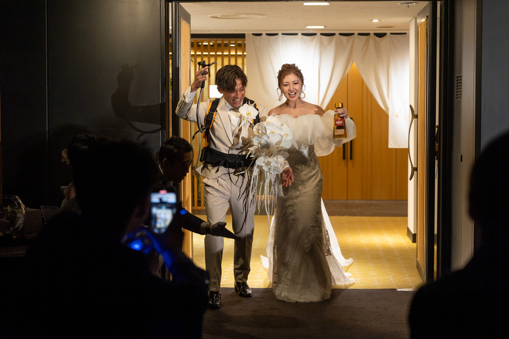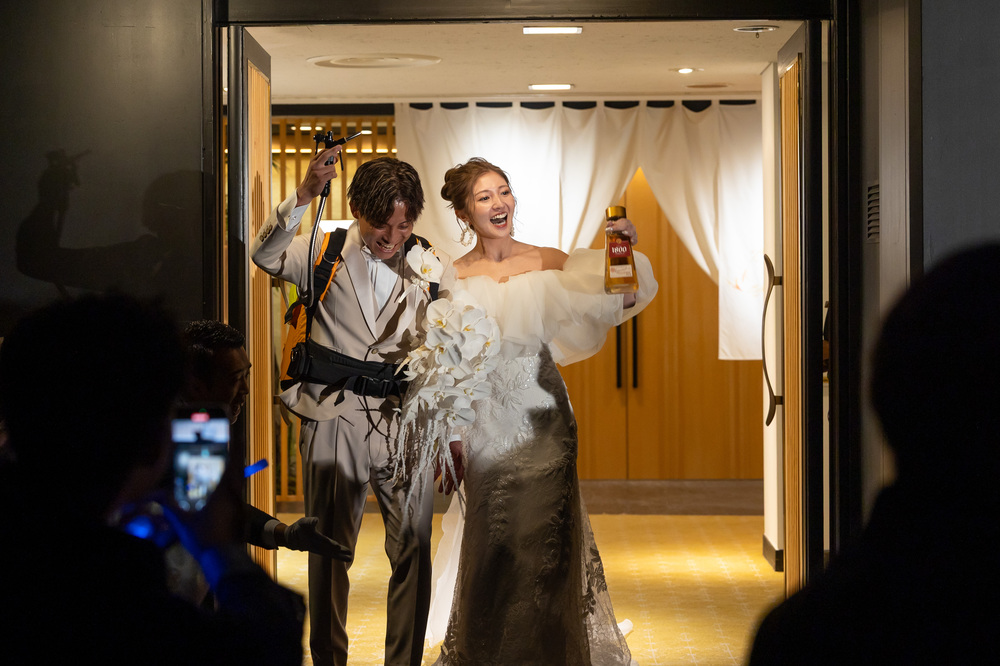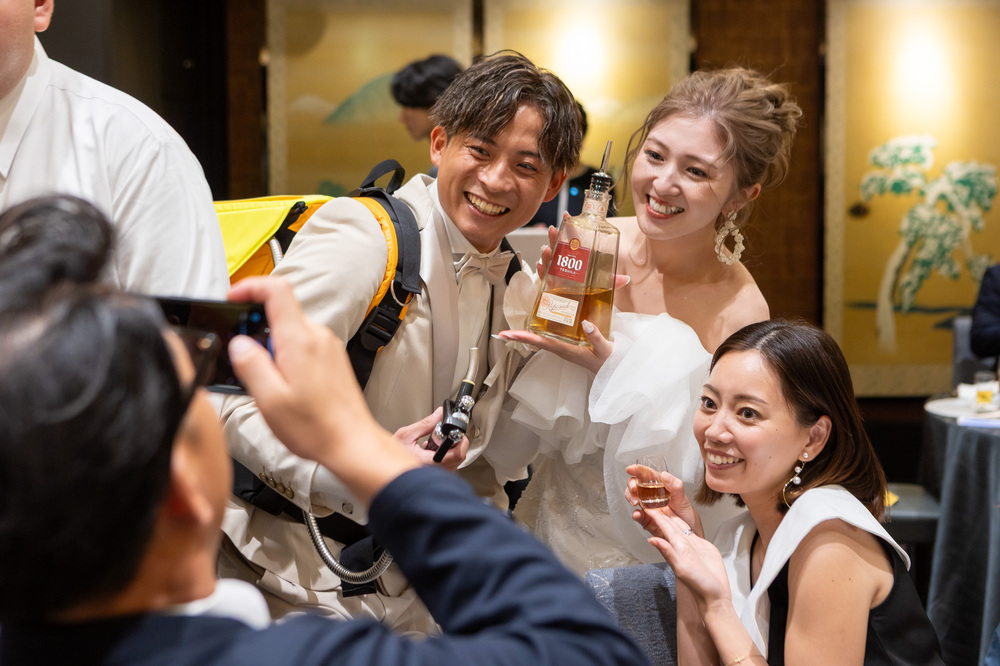 しょいこビールを担ぐ新郎様とテキーラ1800を持った新婦様で
